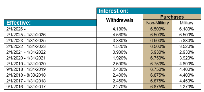Since the difference between the new regular interest rate (4.18%) and the discount rate (6.18%) is less than or equal to 2%, the interest rate for certain types of military and judicial service credit purchases are now capped. As a result, for the 12-months beginning February 1, 2026, the interest rate charged in these service credit purchase transactions is 6.18%.